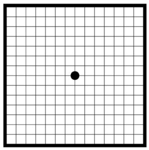 La persona que está afectada por DMAE verá las líneas onduladas, turbias, deformadas,.. y no rectas. E incluso percibirá el enrejado a trozos, o verá el punto del centro como si fuera una mancha aislada en medio del recuadro.