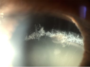 Subluxación de cristalino en la que podemos apreciar material pseudoexfoliativo en la zónula.