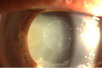 Su principal asociación en el ojo es el glaucoma (la probabilidad de desarrollar glaucoma en 10 años es del 45%), pero repercute en otras estructuras oculares dando lugar a sinequias posteriores, alteraciones corneales, subluxaciones del cristalino y debilidad zonular… contribuyendo todo ello a un mayor fracaso en la cirugía de catarata. En la siguiente imagen vemos el típico aspecto de ceniza o “caspilla” sobre la superficie anterior del cristalino.
